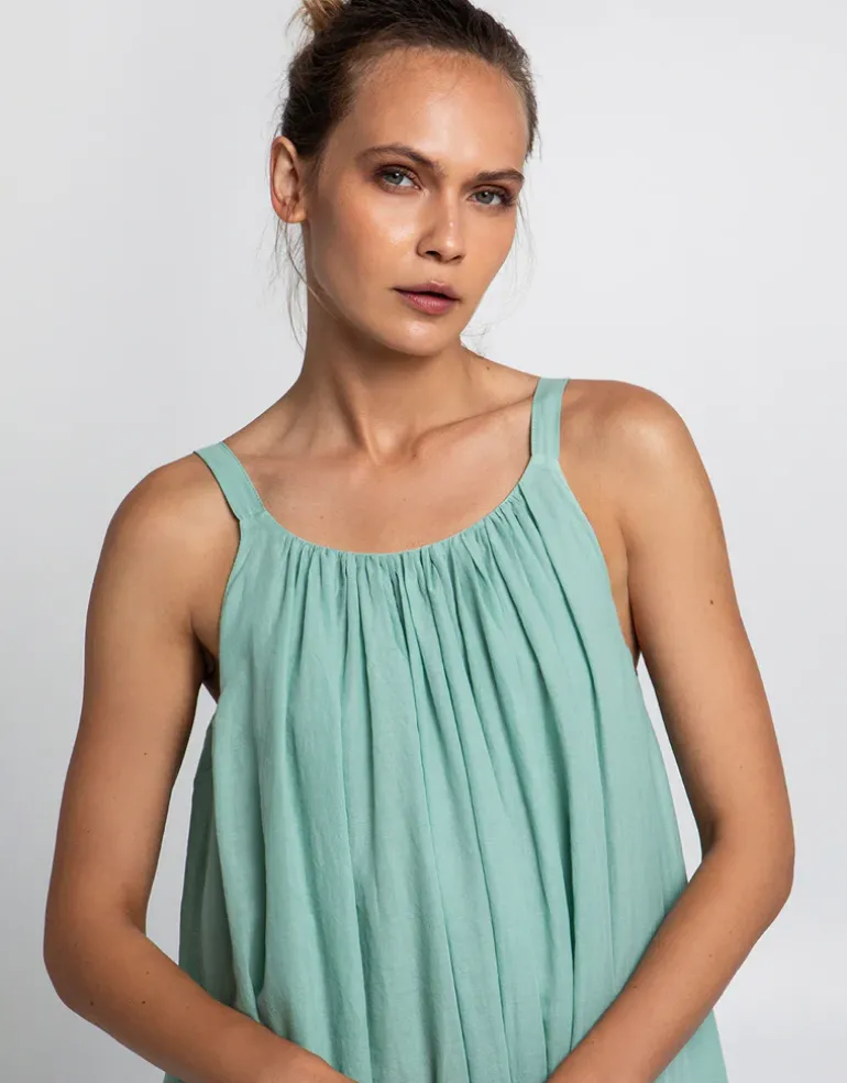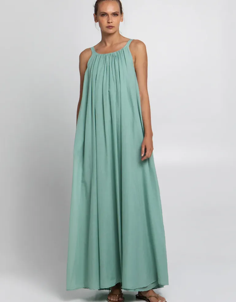 The Gathered Maxi Dress from Greek Archaic Kori in lovely sea green cotton fabric with a flattering scoop neckline and gentle pleats at the front and back, offering a flowing, elegant silhouette. Finished with practical pockets, this maxi dress exudes effortless sophistication.