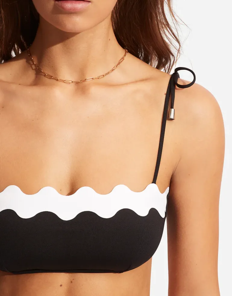 The Gia Ric Rac Bustier Bandeau bikini top from Seafolly is a striking black style with white Gia signature scalloped edging at the neckline. With removable cups, side boning and gripper tape for shape and hold and optional straps for extra support.