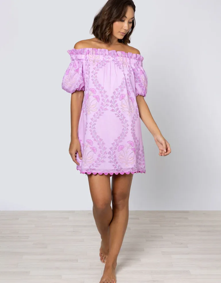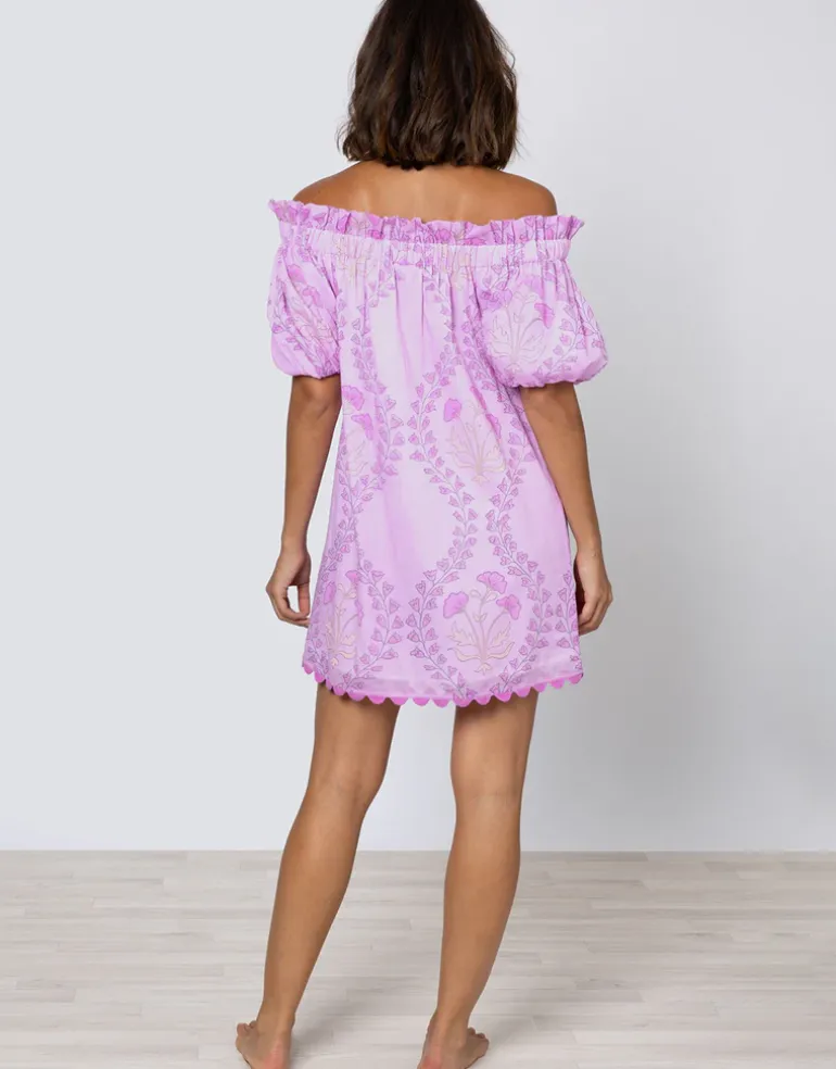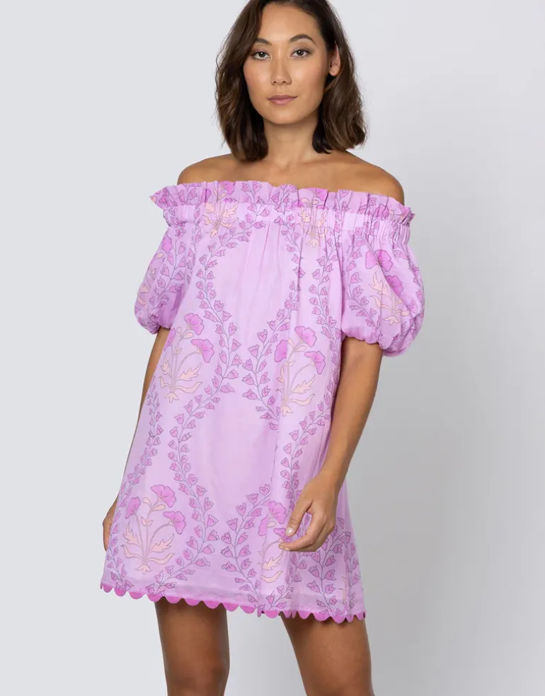 The Ginko Print Off Shoulder Mini Dress with Ric-Rac from Juliet Dunn in a lovely pastel violet and delicate, hand printed peach floral is an off shoulder, mini dress with short puff sleeves, a ruffled, elasticated neckline and Ric Rac finish at the hem.