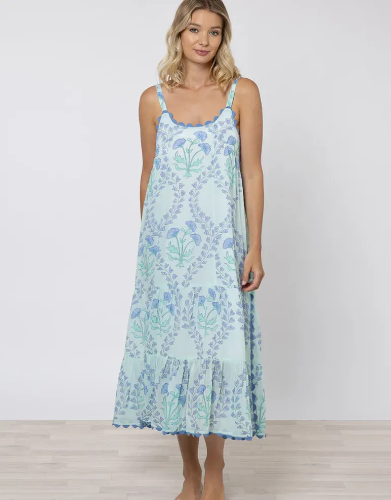 The Ginko Print Swing Dress with Ric-Rac from Juliet Dunn in a lovely pastel blue and delicate, hand printed aqua green floral is a tiered, sleeveless midi dress with a split to the knee, thin straps and Ric Rac finish at the hem, split and neckline.