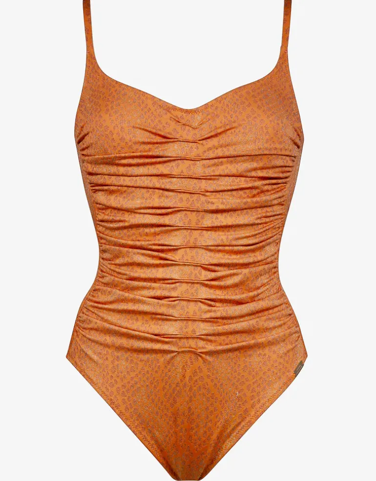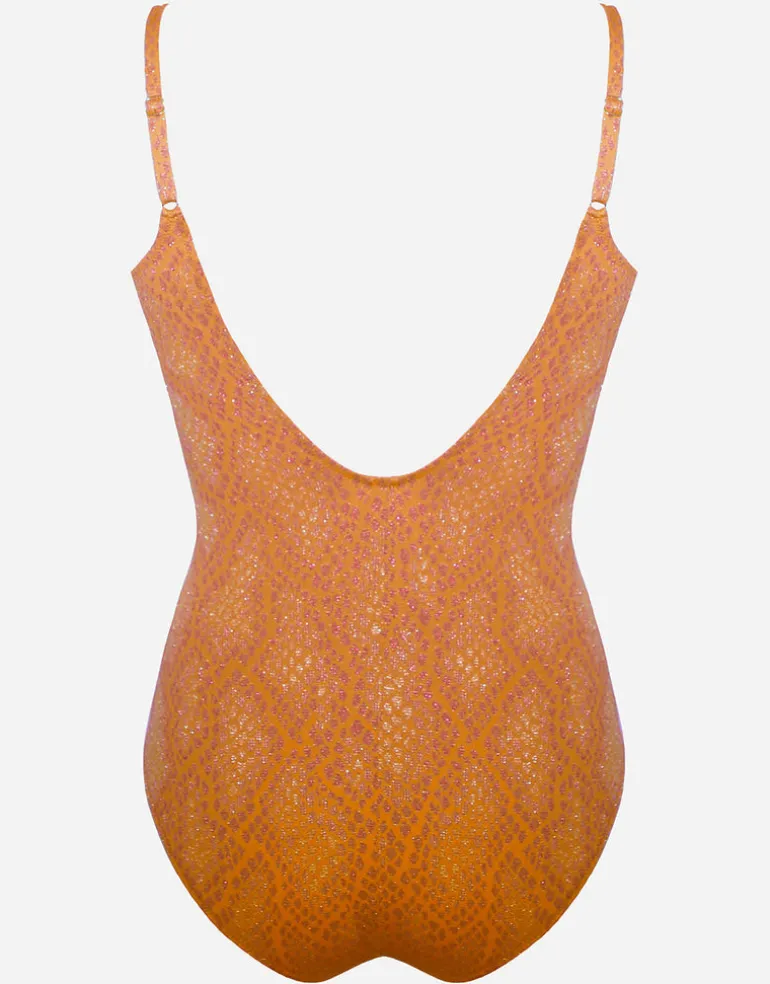 The Glance Ruched Underwired swimsuit by Maryan Mehlhorn is offered in this glamorous and soft apricot with interwoven copper metallic threads. This understated snakeskin print swimsuit has effective ruching at the front and narrow, adjustable straps.