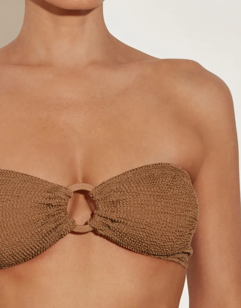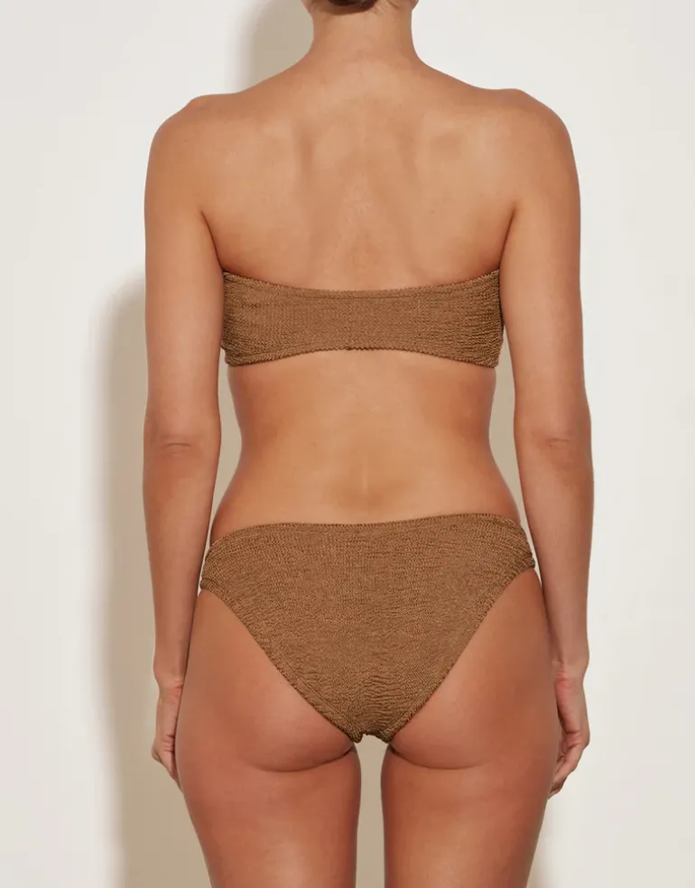 The Gloria bikini set from Hunza G is a classic bandeau style with a tonal fabric covered ring at the front and a cheeky coverage pant with matching rings at the hips. Constructed from their ingenious Crinkle fabric which is designed to flex and sculpt to your body meaning that one size will fit sizes 6 to 16.