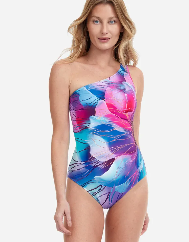 The Golden Blossom One Shoulder swimsuit from Gottex is a pretty style in pink and blue petal print. With asymmetrical one shoulder neckline, soft cups and an adjustable strap.