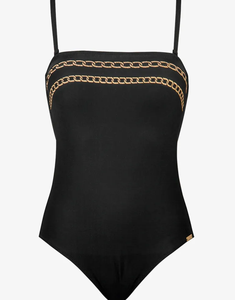 The Golden Chain Bandeau swimsuit from Charmline is a lovely black bandeau style with a double row of chains printed at the neckline. Inside there are moulded cups for shaping and there are also optional straps for added support.