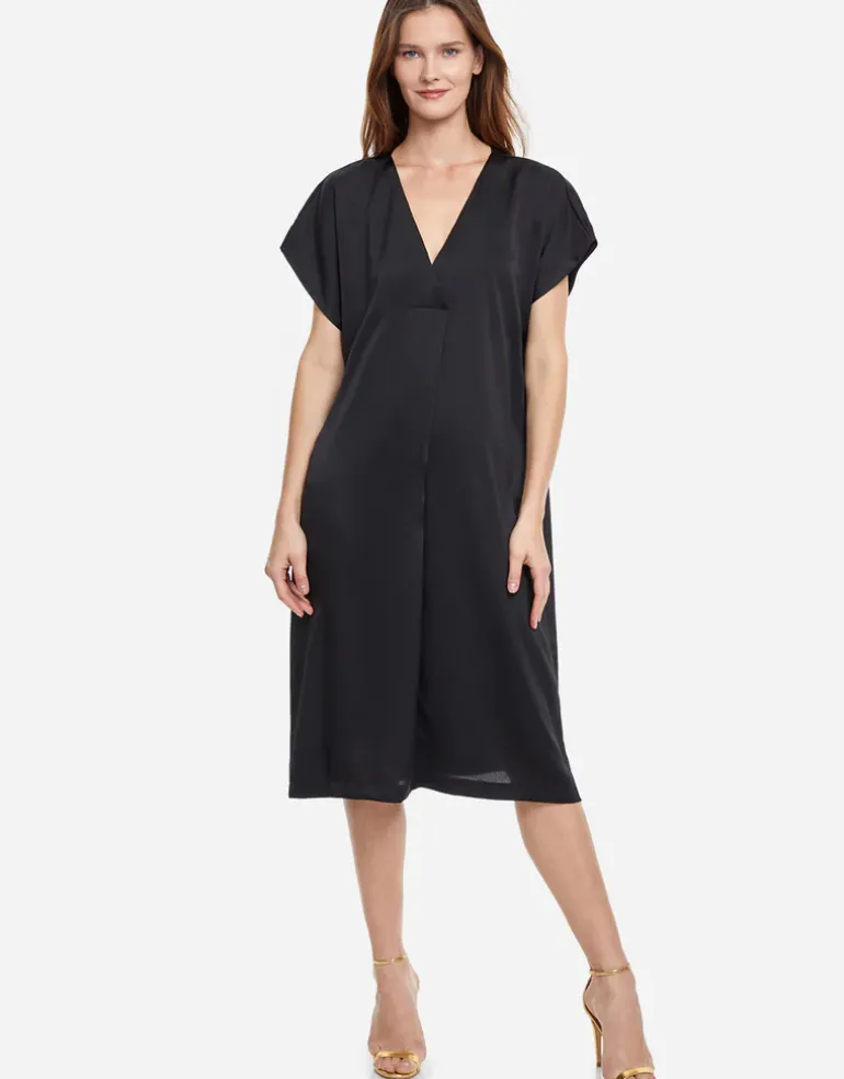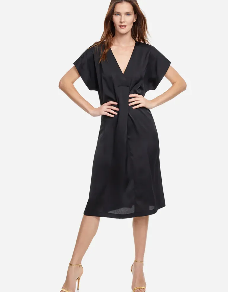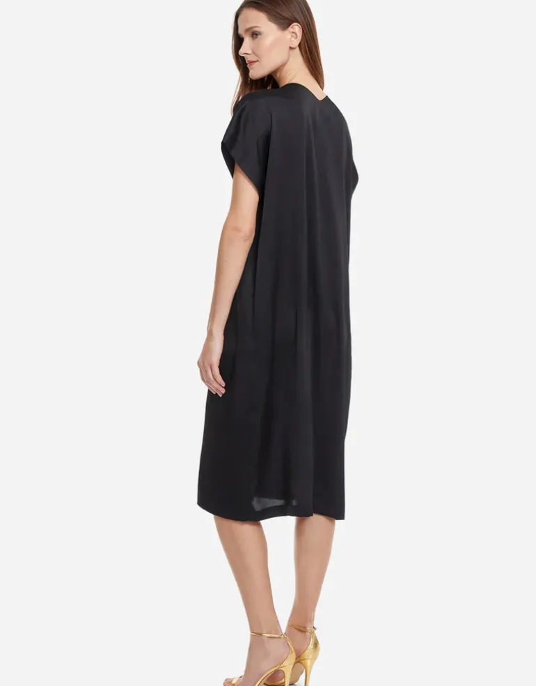 The Golden Touch dress from Gottex is an elegant black midi length dress with a V neck, a wide pleat in the front and short sleeves.