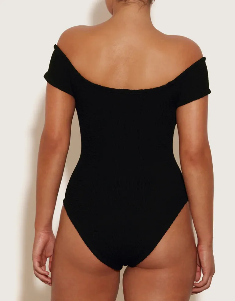 The Grace swimsuit from Hunza G with its off-the-shoulder silhouette and signature crinkle stretch creates an effortless classic retro look. Constructed from their ingenious Crinkle fabric which is designed to flex and sculpt to your body meaning that one size will fit sizes 6 to 16.