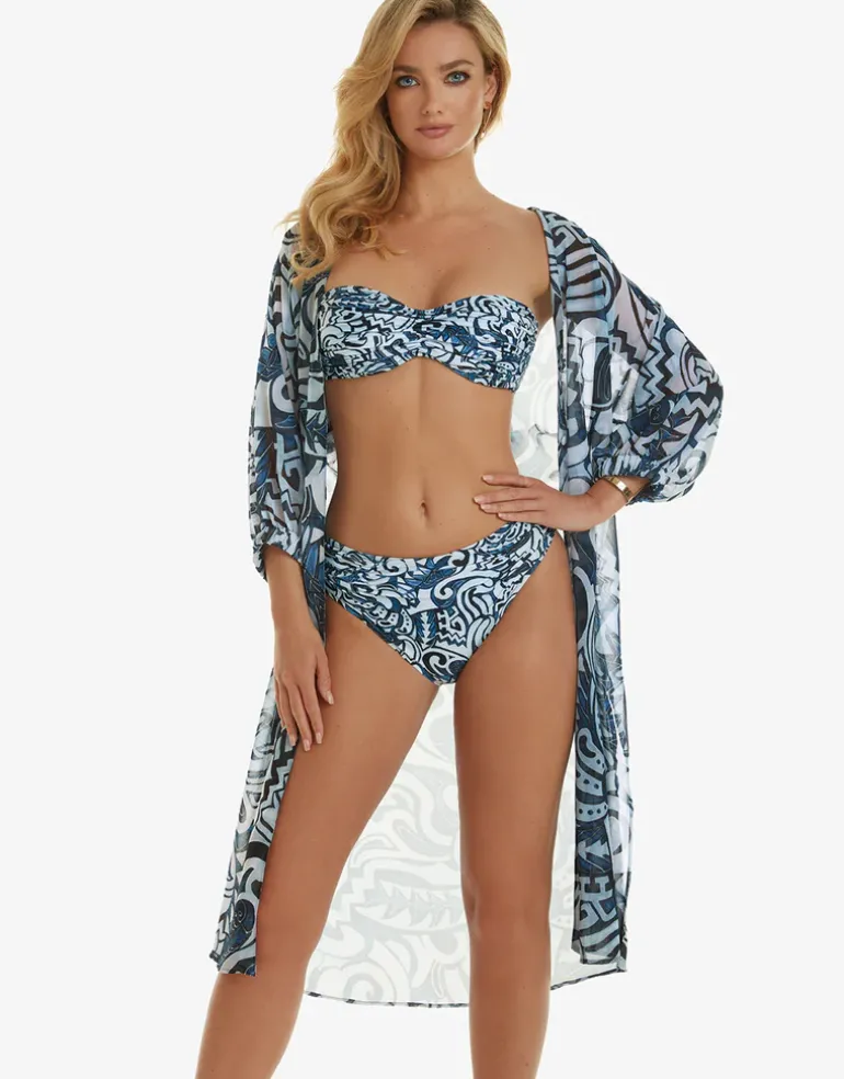 The Graffiti Midi Length beach shirt from Roidal is a blue and white abstract print in classic Roidal style. This midi length beach shirt has long sleeves, gathered at the cuff and a button-through front.