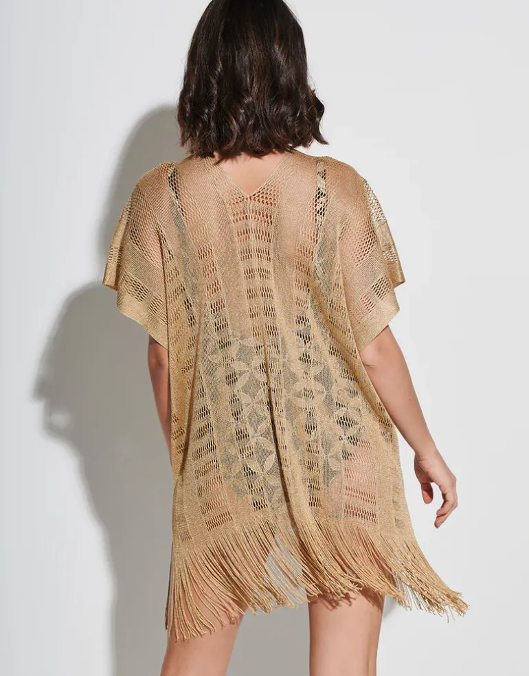 The Guayana Metallic tunic from Tessy by Roidal is a sheer, gold metallic knit tunic featuring a plunging V-neckline, mini in length, and a tasselled hemline. Designed with side slits and a belt for adjustable gathering, it’s a chic and lightweight cover-up.