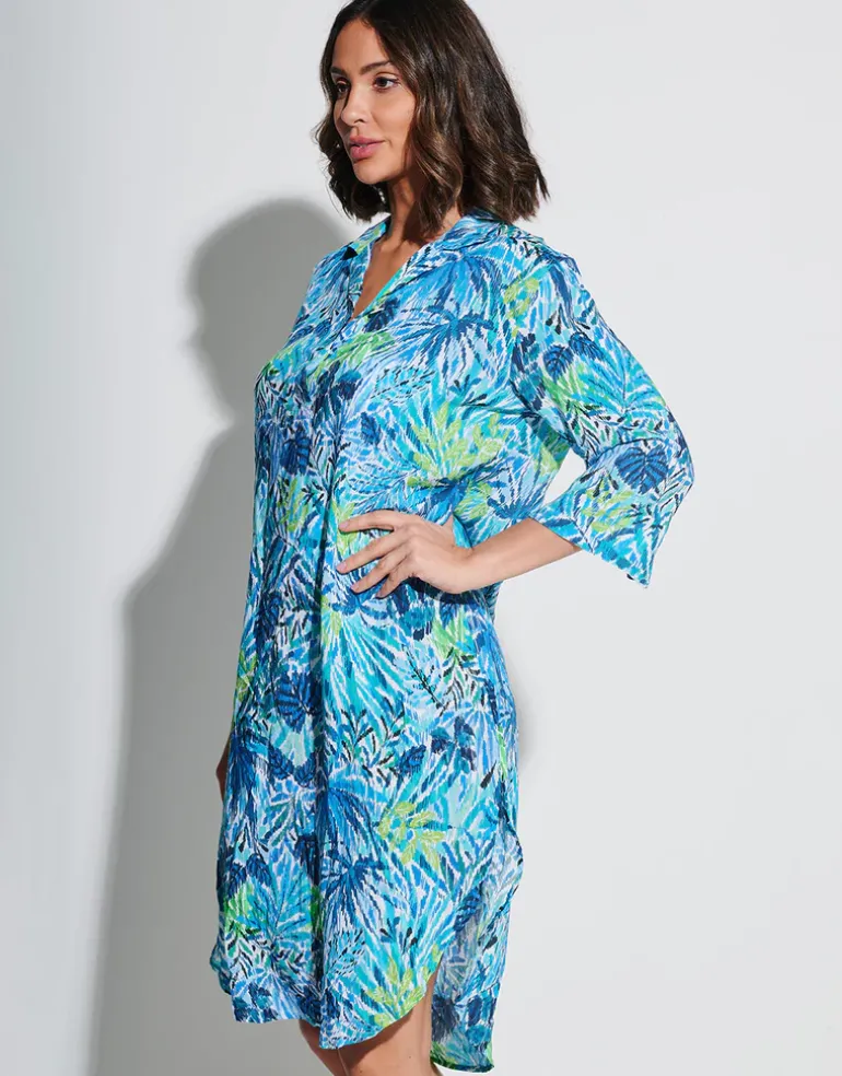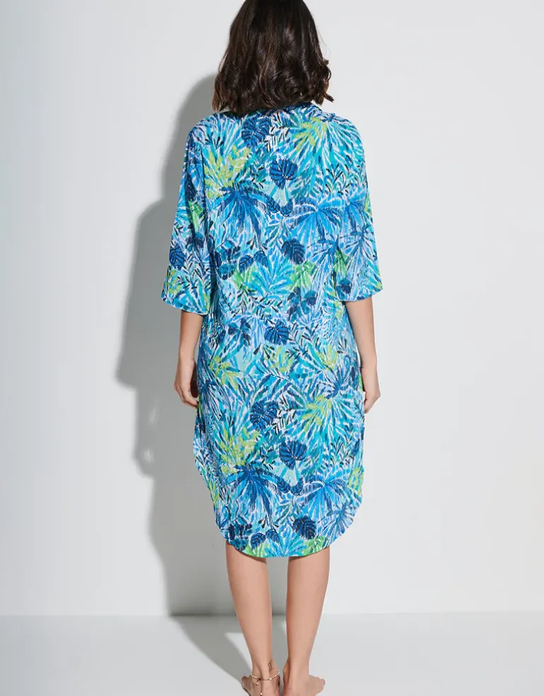 The Haiti Beach tunic from Tessy by Roidal is a stylish knee-length cover-up featuring a vibrant tropical print of greens and turquoise blues. Designed with three-quarter sleeves with cuffs and a classic collar, it blends elegance and practicality for effortless beach style.