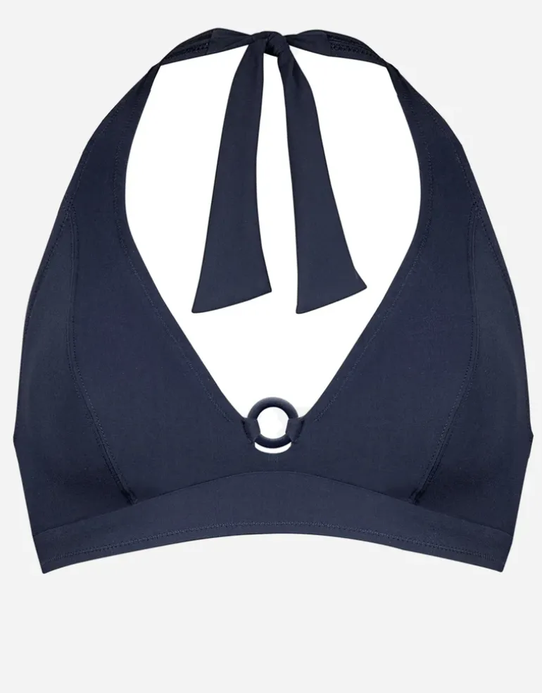 The Harmony Moulded Halter bikini top from Lidea is supportive and comfortable style with ring detail at the centre, a clip back and wide neck ties.