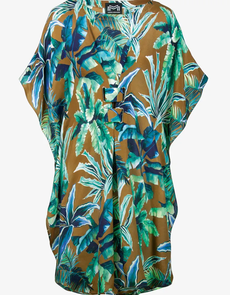The Havana Kaftan from Maryan Mehlhorn is a gorgeous green and turquoise jungle print on tobacco colour background. Mini length with a round neck and double straps threaded through pale gold macro eyelets across the bust, this style is made from beautifully draped viscose silk.