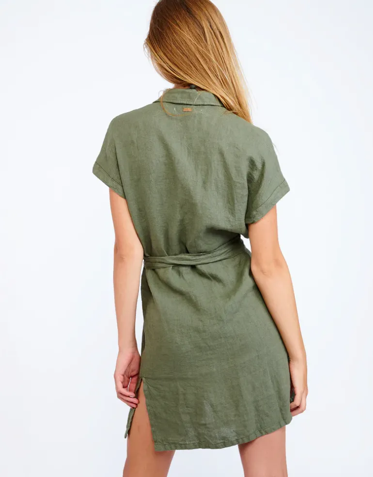 The Hawston Paulina shirt dress from Banana Moon is a great linen beach cover up. With buttons at the front, side slits, a collar, short sleeves and a belt at the waist.
