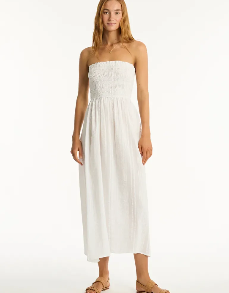 The Heatwave Bandeau dress from Sea Level is a lovely white style with a full skirt and an elasticated shirred bandeau bodice offering an easy and comfortable fit.