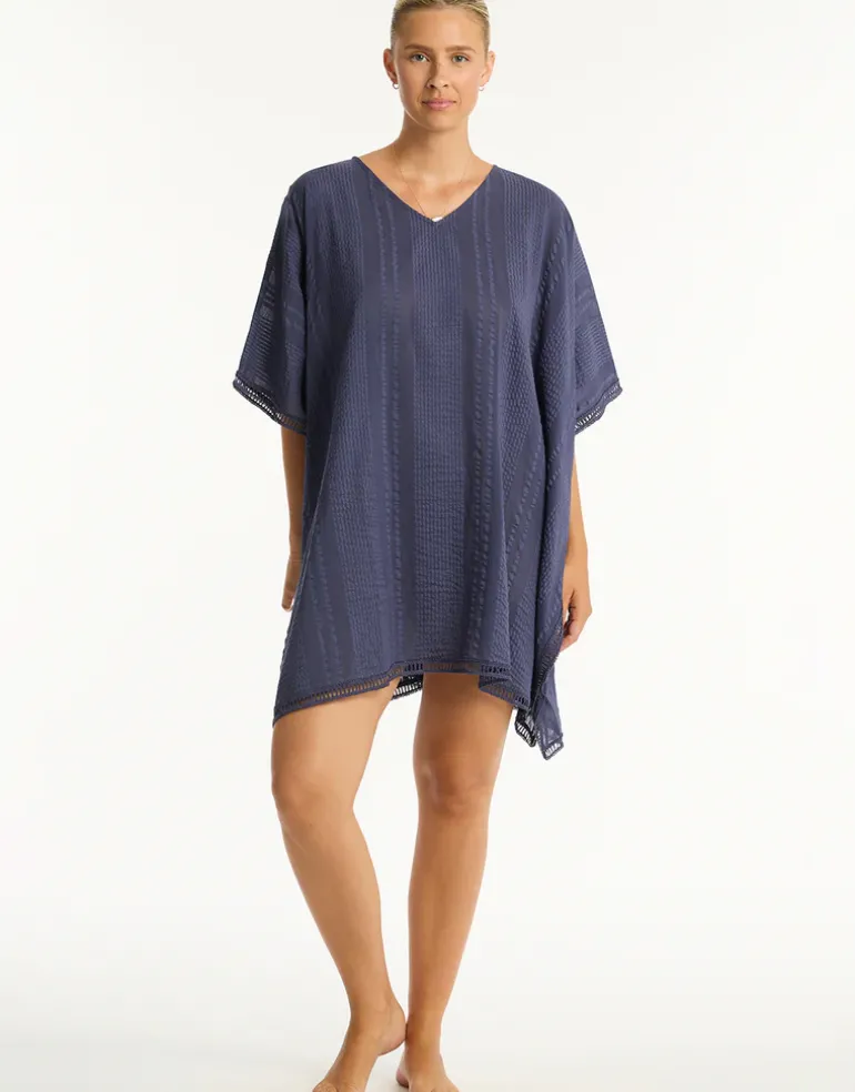 The Heatwave kaftan from Sea Level is a great cover up in dark blue made from seersucker stripe textured fabric with ladder trim at the hems.