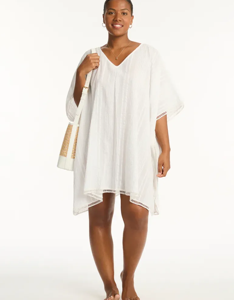 The Heatwave kaftan from Sea Level is a great cover up in white made from seersucker stripe textured fabric with ladder trim at the hems.