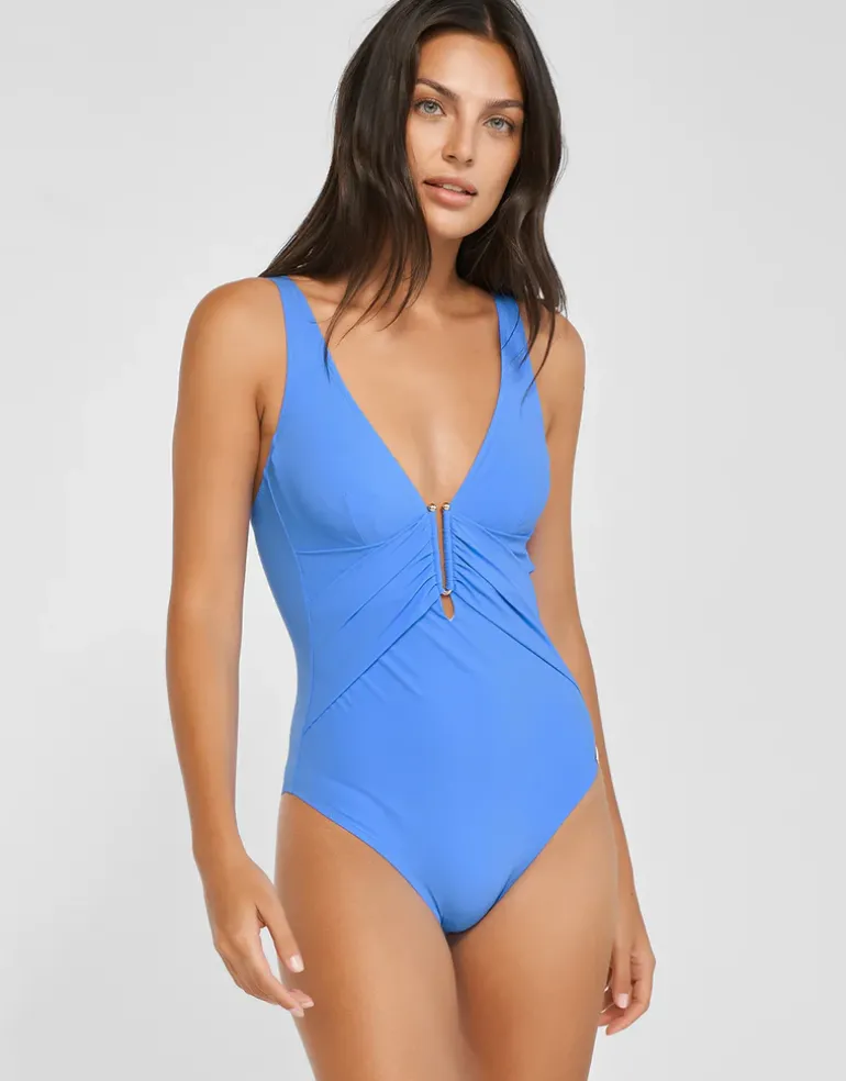 The Honesty Underwired swimsuit from Maryan Mehlhorn is a beautiful blue plunge front style with a large metallic U bar detail at the centre and bust gathers below. The adjustable straps are straight at the back and meet a shapely back line which finishes in a low V. The design of this swimsuit and the underwire make it a very supportive and secure fit.