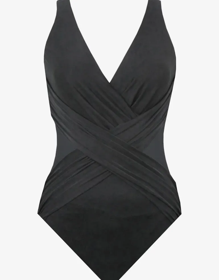 The Illusionist Crossover swimsuit from Miraclesuit is a wonderfully comfortable slimming shape with plunging neckline, criss-cross draping at the front and mesh panels at the sides of the waist.