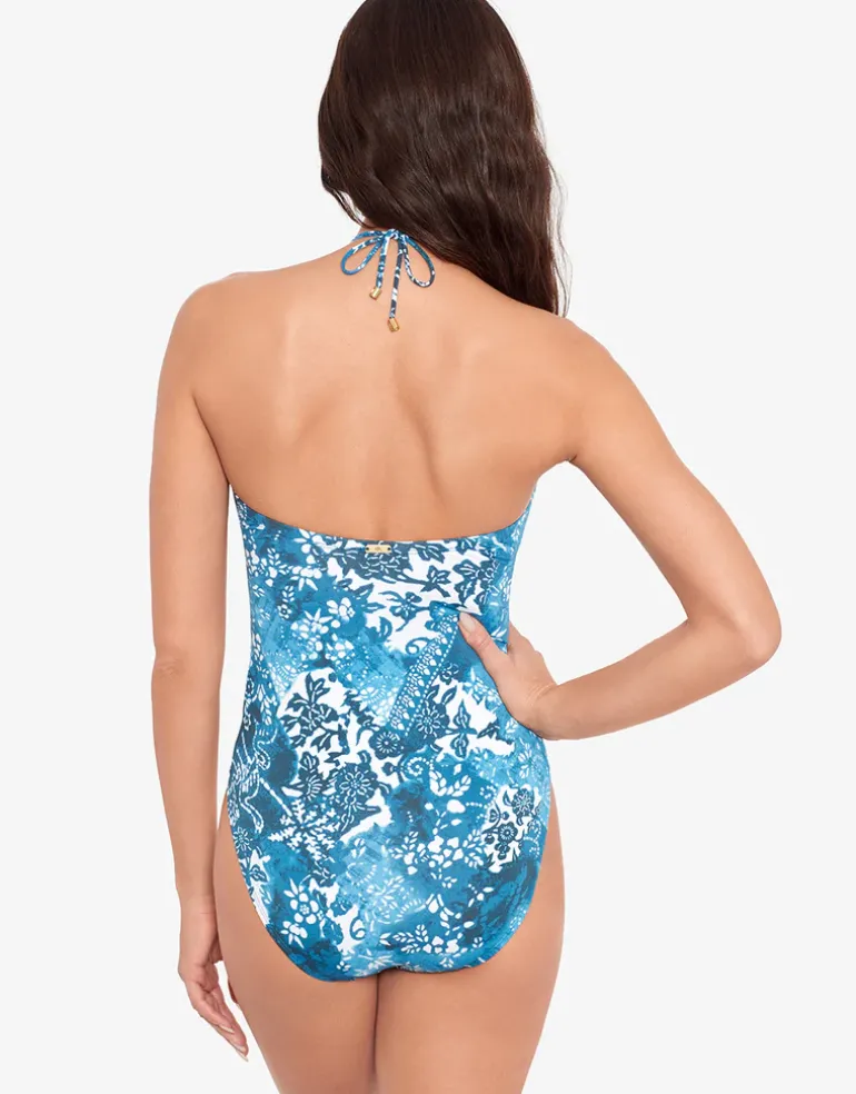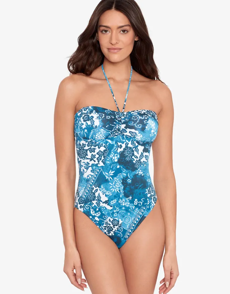 The Indigo Patchwork Halter Bandeau swimsuit from Lauren Ralph Lauren is a beautiful blue patchwork floral design in a bandeau style with gathered bust, removable cups and a tie that can be worn around the neck for support or tied at the bust for a strapless look.