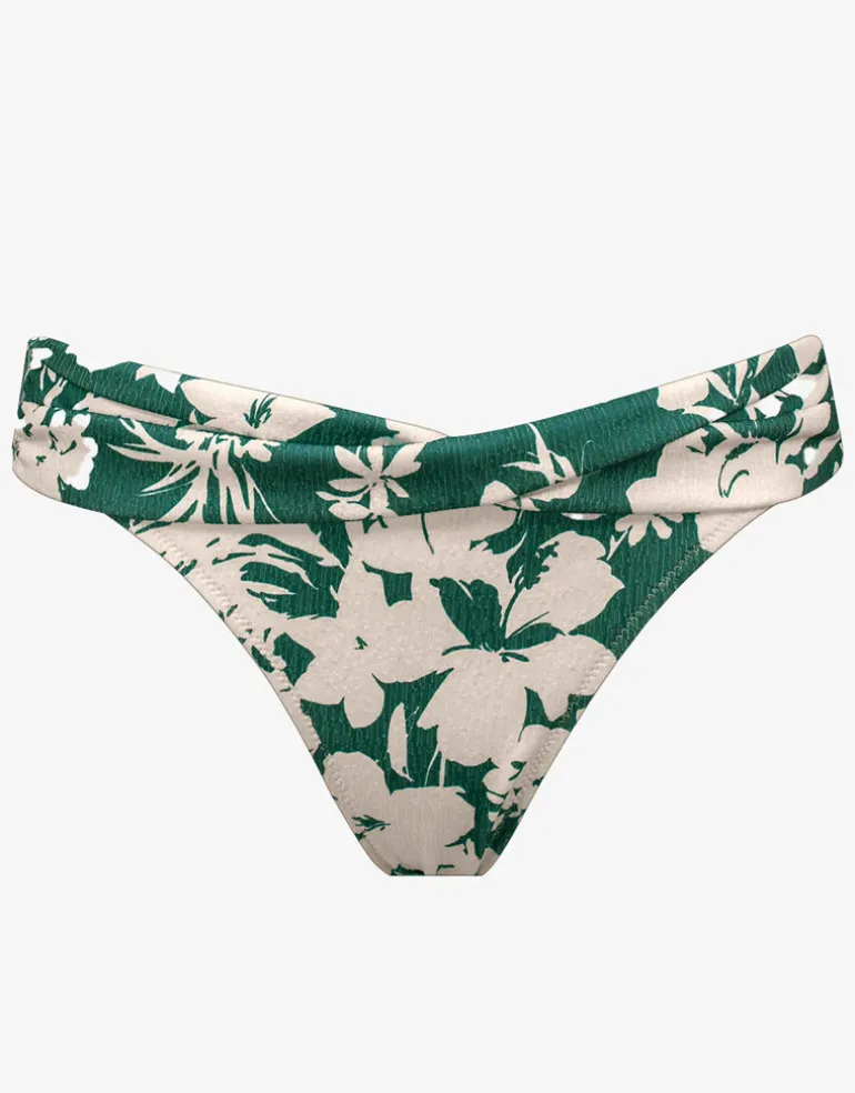 The Inside Nostalgia Twist Front bikini pant from Watercult is a lovely dark green and creamy white floral print in a twist front style with moderate coverage.