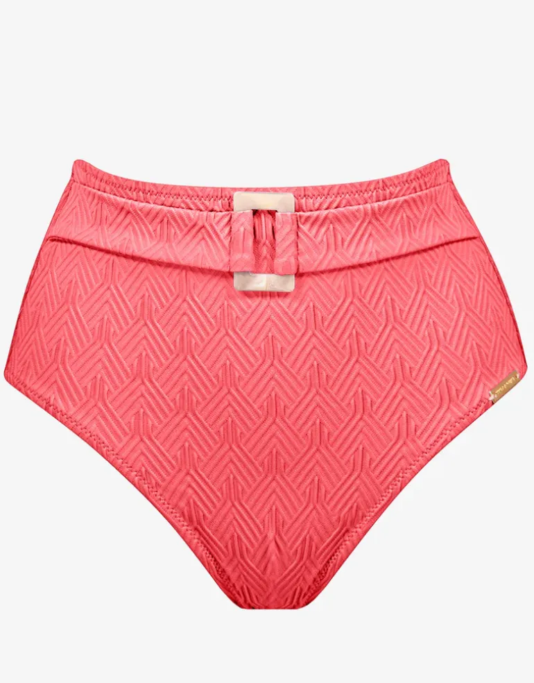 The Island Nostalgia Belted High Waist bikini pant from Watercult is made from a lovely textured fabric woven with an understated geometric Art Deco design. This high waist style pant has a wide belt at the front with a square ring at the centre front.