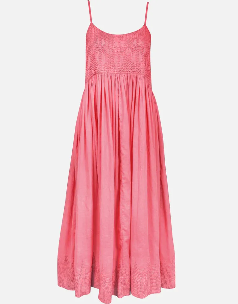 The Island Nostalgia Maxi dress from Watercult in a stunning coral pink has a full gathered skirt, tonally embroidered bodice, narrow straps and a tie at the back.