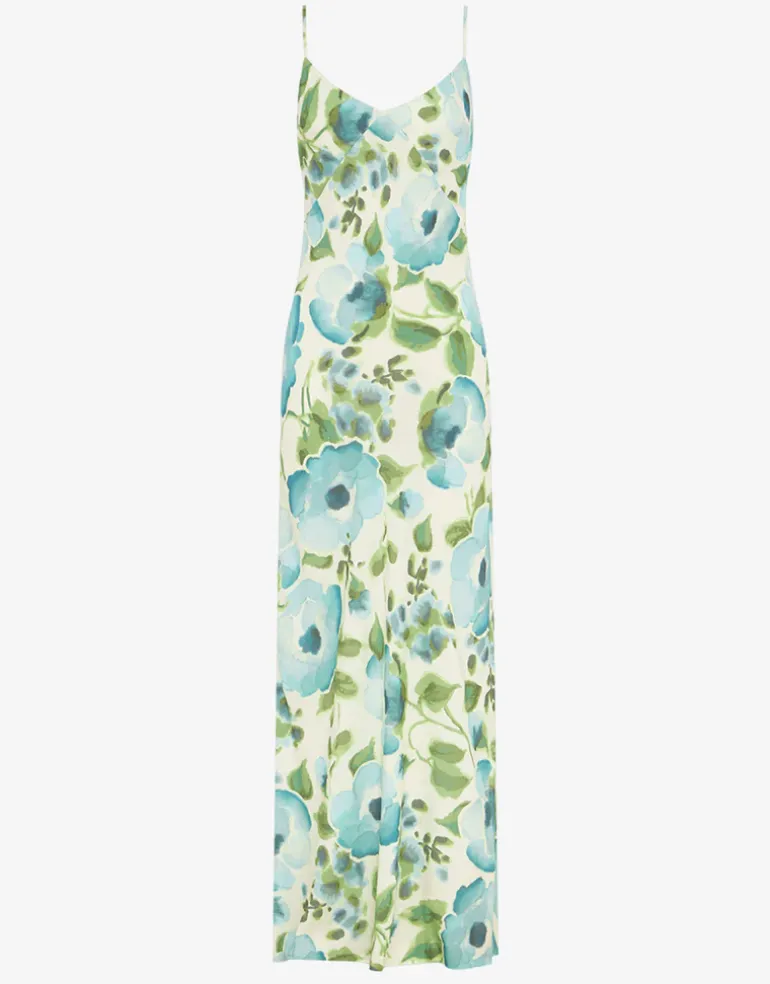 The Isles Slip Maxi dress from Peony in a beautiful hand painted floral watercolour print is an elegant maxi dress with fine, adjustable straps and a low v neckline and scooped back. Floor grazing in length, in a lovely lightweight and soft touch EcoVero fabric.