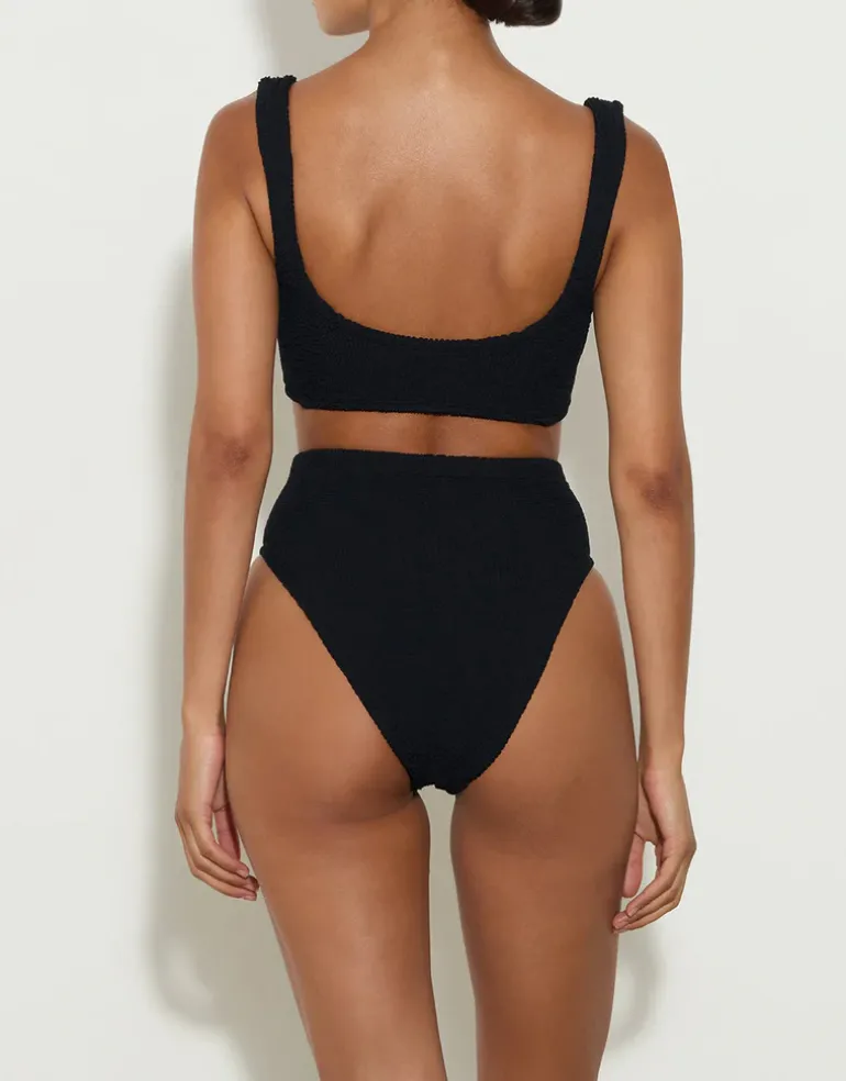 The Jamie bikini set from Hunza G in classic black is constructed from their ingenious Crinkle fabric which is designed to flex and sculpt to your body meaning one size will fit sizes 6 to 16. The bikini top is a crop style with a flattering twist front and wide straps while the pant is high waisted offering moderate coverage.