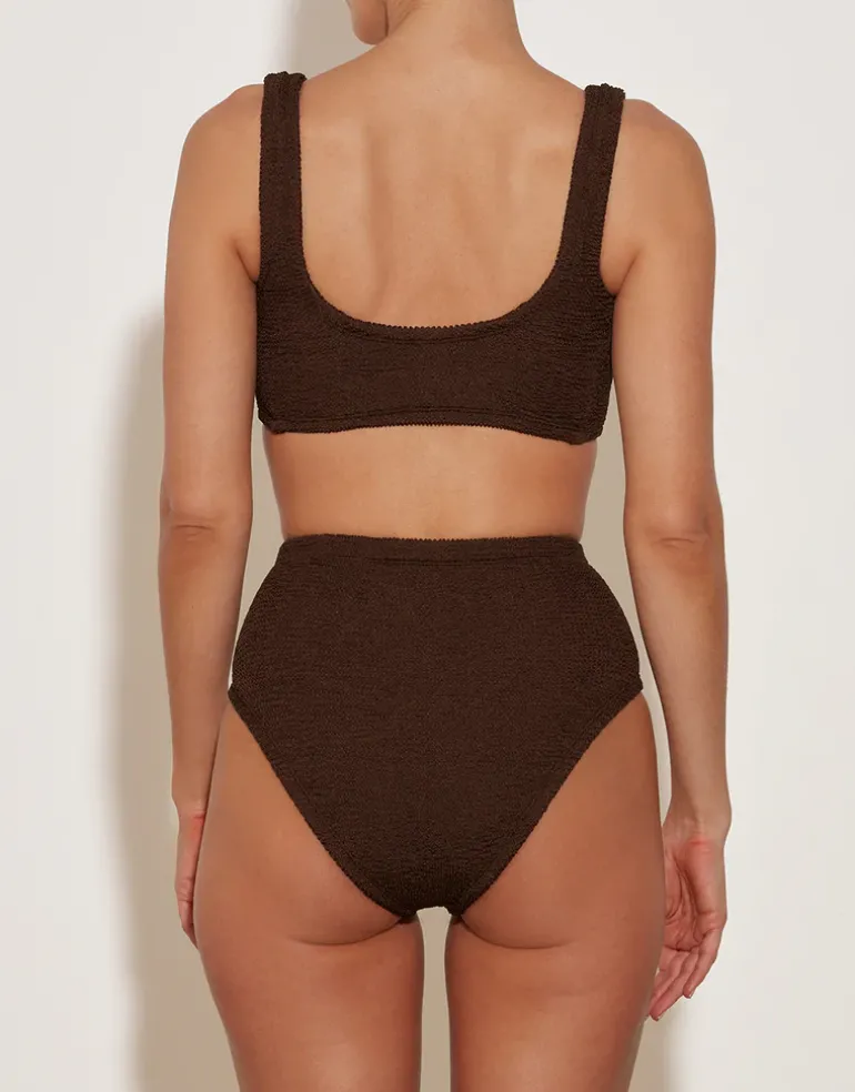 The Jamie bikini set from Hunza G in this luxurious chocolate brown with a metallic sheen is constructed from their ingenious Crinkle fabric which is designed to flex and sculpt to your body meaning one size will fit sizes 6 to 16. The bikini top is a crop style with a flattering twist front and wide straps while the pant is high waisted offering moderate coverage.