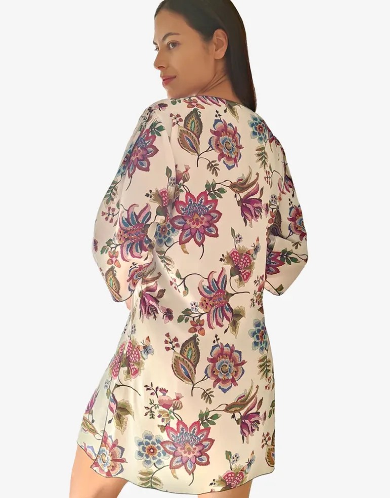 The Jasmine Beach dress from Nuria Ferrer in a lovely purple floral print on crisp white is a mini style dress with a v neck and sleeves that flare at the elbow.