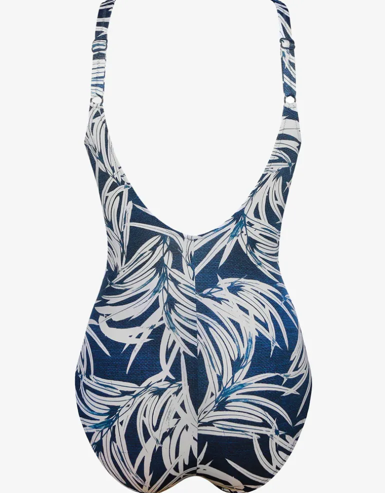The beautiful Jean Breeze Twist Front swimsuit from Charmline is a gorgeous blue hessian print with white palm fronds. In a twist front design with soft cups and adjustable straps.