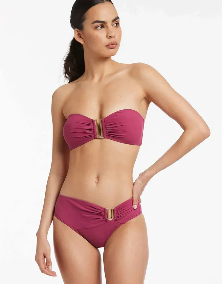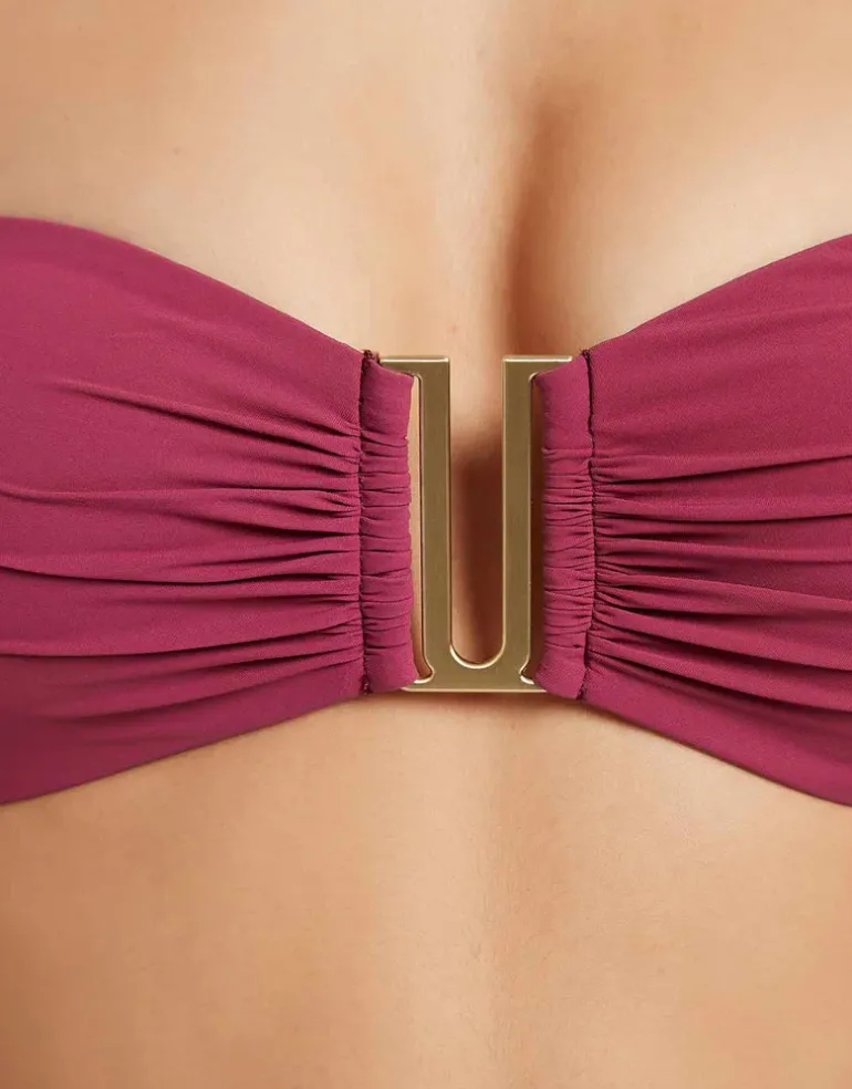 The Jetset U Trim Bandeau bikini top in Orchid pink from Jets is a beautiful shaped bandeau top with gathered cups and metallic gold U bar detail. There is a matching metallic gold clip at the back, an optional adjustable neck strap and inside there are moulded cups, gripper tape and side boning for ultimate shape and support.