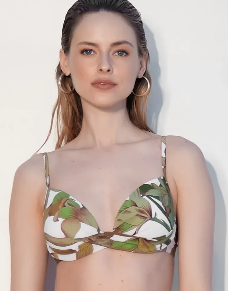 The Journey Moulded Underwired Twist Front bikini top from Maryan Mehlhorn is a pale pink and green foliage print bikini top with a twist wrap detail at the front, adjustable straps, soft moulded cups and underwire.