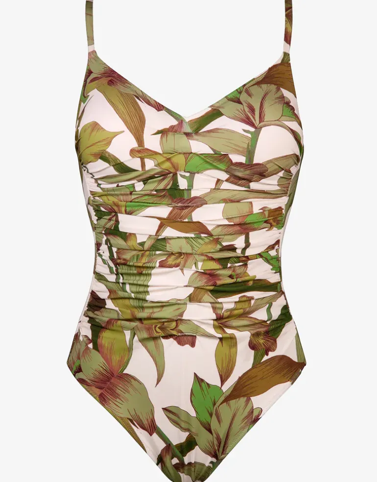 The Journey Ruched swimsuit from Maryan Mehlhorn is a pale pink and green foliage print swimsuit with a V neck and ruched front. The inside is fully lined with fixed soft cups for shape and support and the straps are adjustable.