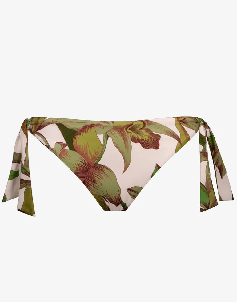 The Journey Tie Side bikini pant from Maryan Mehlhorn is a pale pink and green foliage print bikini pant with wide ties to the sides.