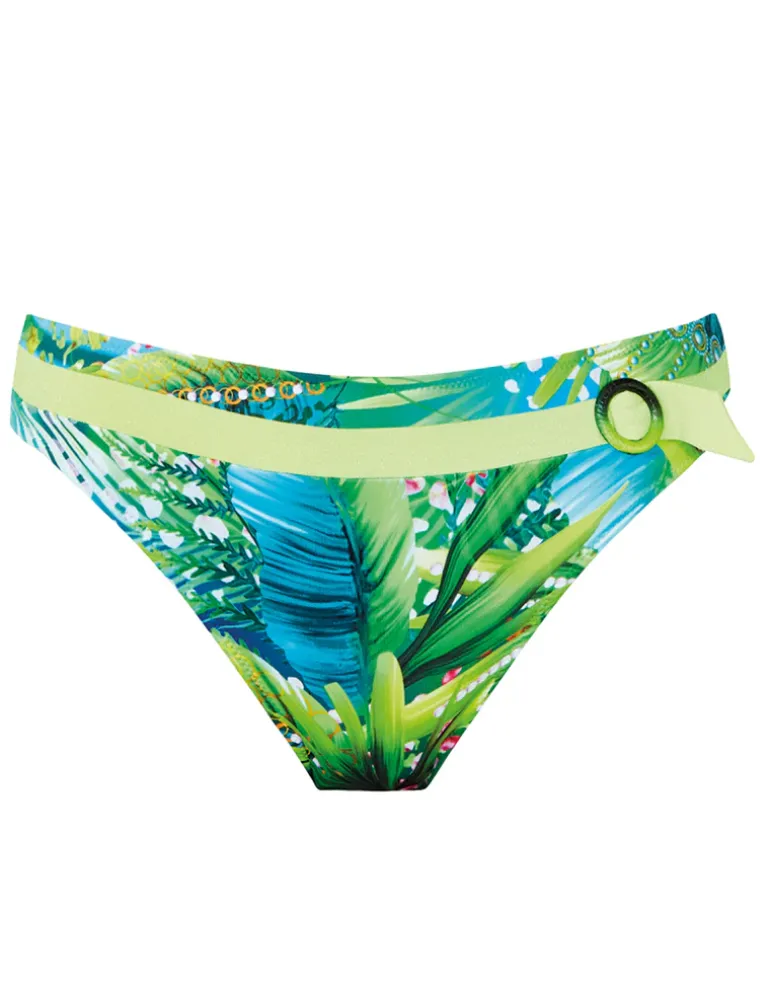 The full coverage Jungle bikini pant from Nuria Ferrer in tropical green print with lime green banding around the waist and sash and ring detailing. This bright green print from Nuria Ferrer has just got to make you smile!