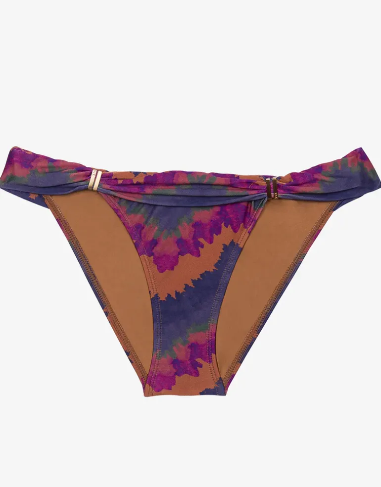The Kamau Bia Tube bikini pant from ViX is a pretty dark blue and purple print bikini pant in classic full cut Bia shape signature gold-coated ViX branded sliders.