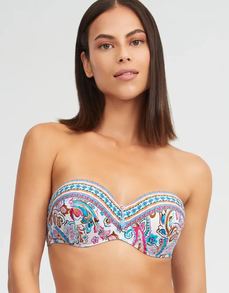 The Laia Underwired Bandeau Bikini Top from Nuria Ferrer in a paisley turquoise and pink print on a white background is a strapless style with underwired foam cups and adjustable straps for support. Featuring a lovely printed border over the cups, adding an elegant finishing touch.