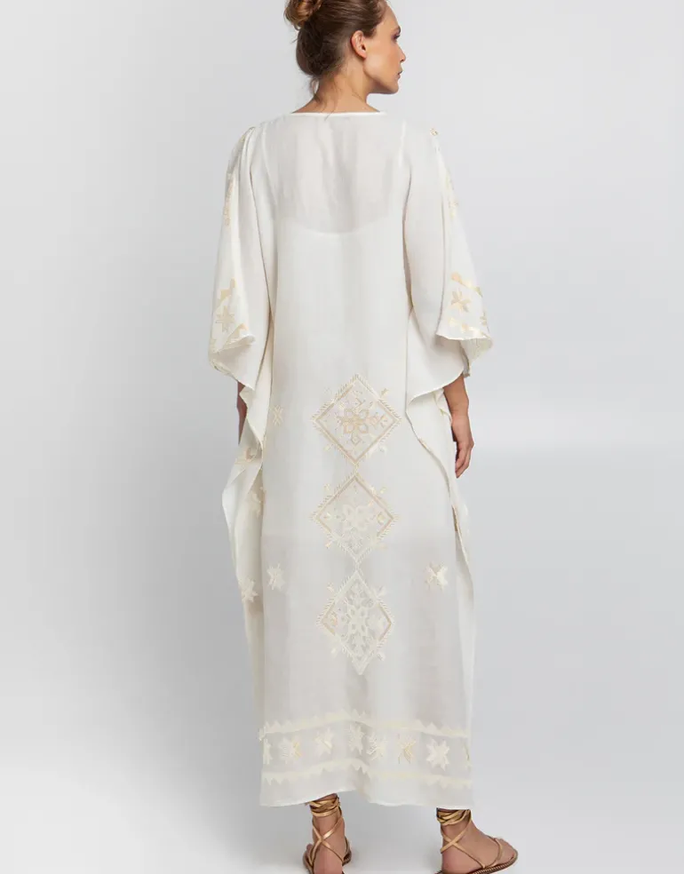 The Lefkada Kimono Sleeve Maxi kaftan from Greek Archaic Kori is a graceful maxi dress with a deep V-neckline, button detailing down to a wide, pleated waistband. The design features three-quarter kimono-style sleeves and is lined with a cotton petticoat for added comfort. Delicate champagne-coloured embroidery in floral and geometric patterns beautifully decorates the soft natural fabric, creating a look of refined elegance and intricate craftsmanship.