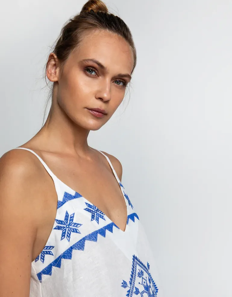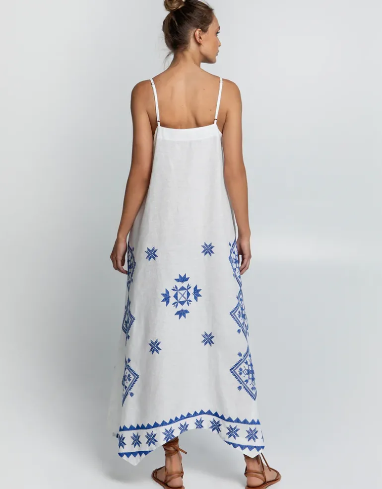 The Lefkada Strappy Maxi Dress from Greek Archaic Kori is a stunning maxi-length linen dress featuring a scalloped hem for an asymmetrical silhouette. This elegant dress features thin straps, a defined plunging V-neckline and is embellished with delicate blue embroidery which beautifully contrasts against crisp white fabric.