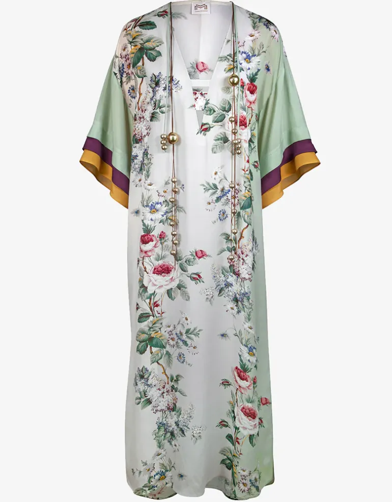 The stunningly beautiful Liaison kaftan from Maryan Mehlhorn is made from a silk viscose mix fabric. Extravagantly styled in an oversized cut, wide sleeves with contrasting hems, a V-neckline with multi-dimensional decorative spheres on delicate, detachable leather ties.
