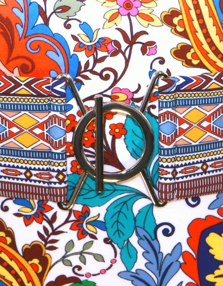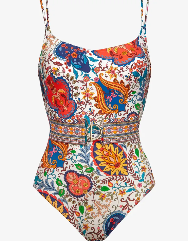 The Libertine Underwired swimsuit from Maryan Mehlhorn is a folkloristic print mixed with ditsy florals in bold and striking summery colours. This beautiful underwired swimsuit style has adjustable double spaghetti straps and a wide belt fixed to the sides and closed at the front in a stunning art deco-esque buckle.