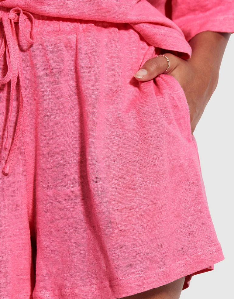 The Linen Jersey beach shorts in pink from Seafolly are a lovely loose fitting, mini-length short with soft elasticated waist, drawstring tie and pockets in the side seams.