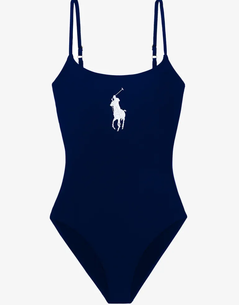 The Logo Icons Kennedy swimsuit from Polo by Ralph Lauren in the classic Kennedy silhouette is a tank-style one-piece with narrow, adjustable straps, a low scoop back and a mid-cut high leg for a flattering fit while removable padded cups offers great shape. This one piece features a large, Polo pony logo on the front in contrasting white embroidery.