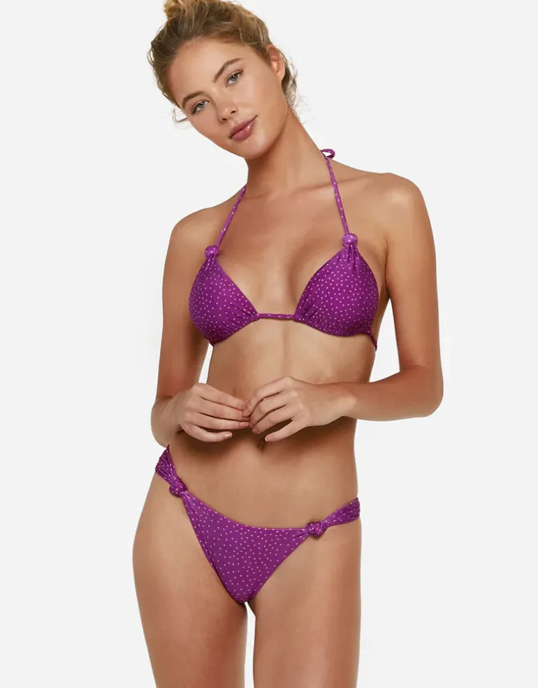 The Louise Mia Cheeky bikini pant from ViX is a pretty ditsy pink spot on purple print. Cut small on the bottom and with knot detail at the front, this pant offers minimal coverage at the back and is great for tanning.