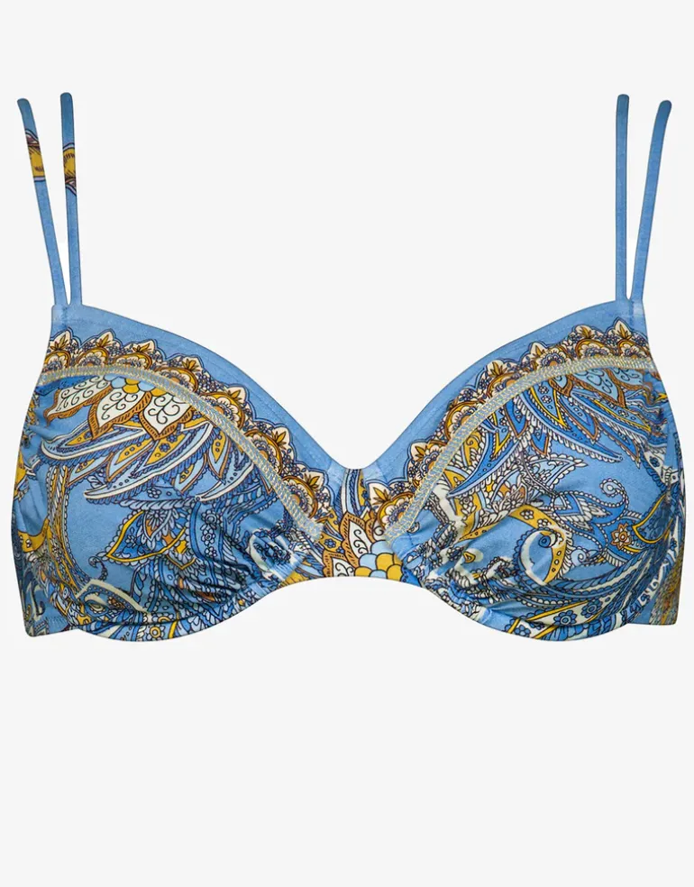 The Majorelle Underwired bikini top from Maryan Mehlhorn is an elegant, double-strap style bikini top in an ornamental paisley blue print. Supportive, underwired cups and convertible, adjustable straps complete this sophisticated silhouette.