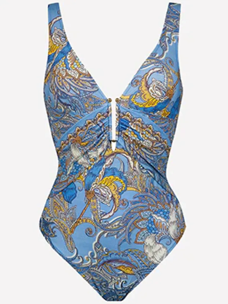 The Majorelle Underwired swimsuit from Maryan Mehlhorn is a fabulous blue paisley design in a V neck style with diagonal gathers under the bust and a deep, narrow U bar detail at the centre and adjustable straps.