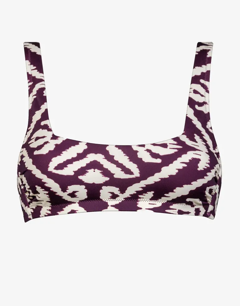 The Makro Notion Bralette bikini top from Watercult is a gorgeous dark aubergine and cream oversized ikat-inspired print cropped tank-style bikini top with soft moulded cups. a clip back and adjustable straps.