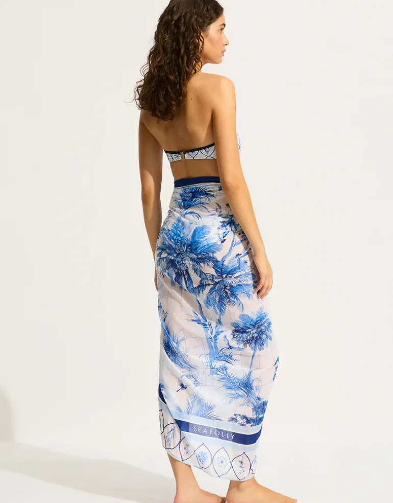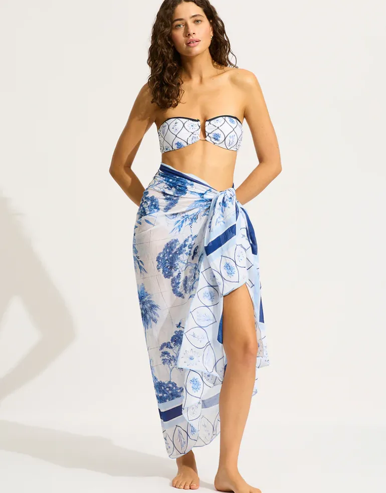 The Marbella Sarong from Seafolly in a serene blue foliage print on a white base has a lovely floral white and blue border. With multi wear styling options, this sarong can be paired with any of the Seafolly Marbella range.