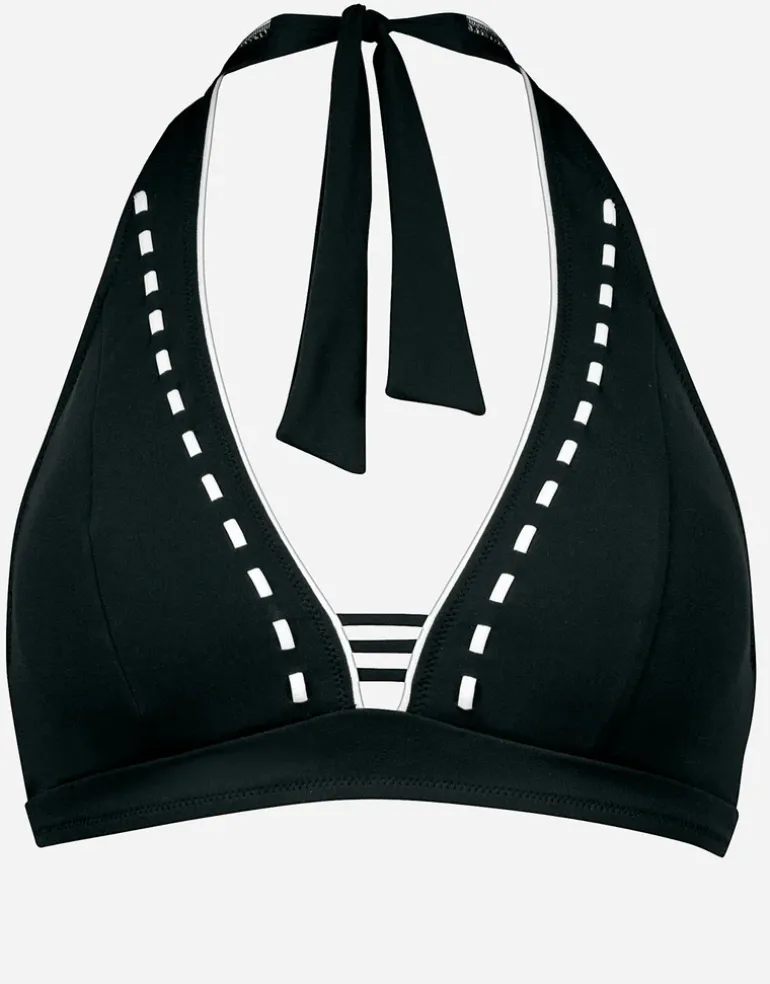 The Marine Mindset Halter bikini top from Lidea has a lovely shape with moulded cups, ladder detailing at the centre, contrasting white stitch and piping detailing at the neckline and wide ties at the neck.
