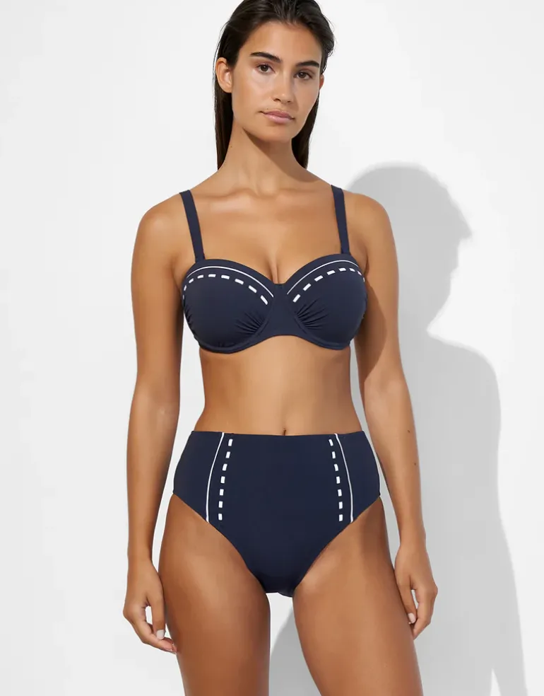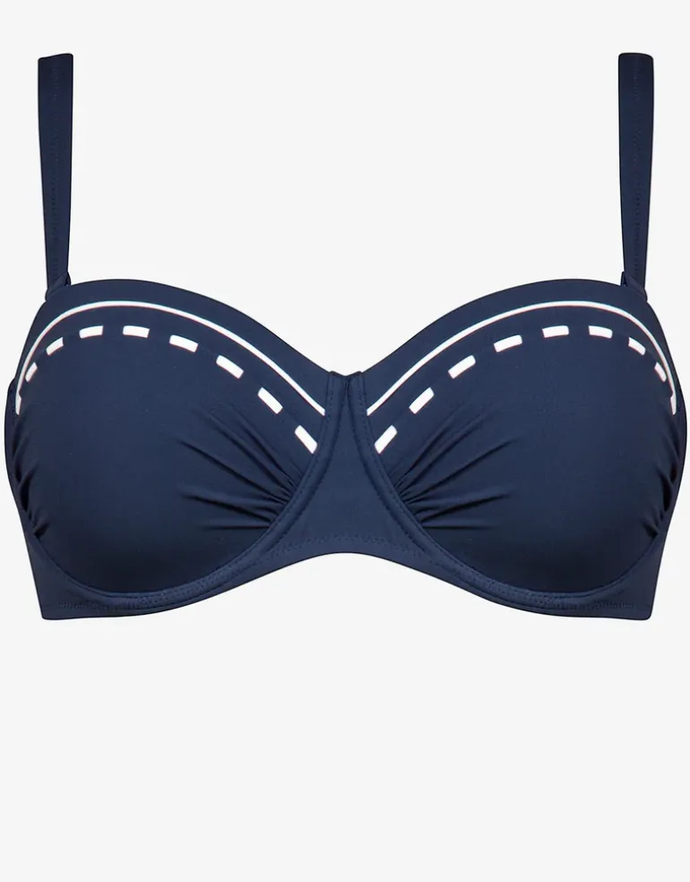 The Marine Mindset Underwired Bikini Top from Lidea has moulded, underwired cups with contrasting ladder and piping detail at the top and gathering on each side of the cup. Removable and adjustable straps add perfect functionality to this understated bikini top.
